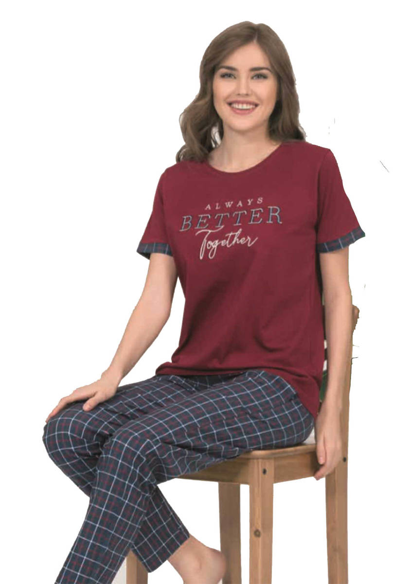 Poleren Kısa Kol Yazılı Desenli Pijama Takımı 5933 | Bordo