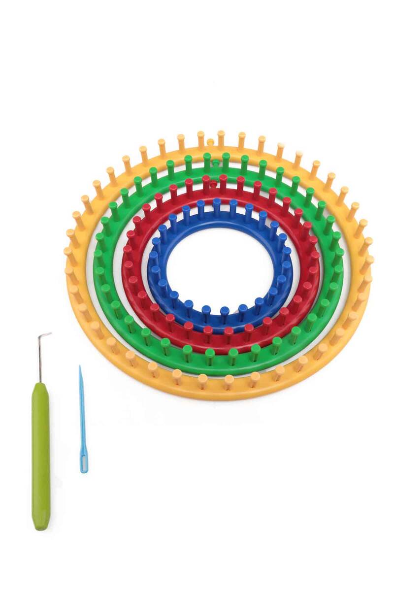 Örme Tezgahı Kiti: Bu yuvarlak örgü tezgah setiyle güzel şapkalar,atkılar ve daha fazlasını örün.Ekstra küçük ve büyük 4 dokuma tezgahı,bir iplik iğnesi,bir dokuma tezgahı,şapka yapma talimatları içerir.